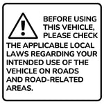 Disclaimer: Before using this vehicle, check the applicable local laws relating to your intended use of the vehicle on roads and road related areas. This product is intended for use on safe, dry, smooth and level hard surfaces. Always wear safety equipment.