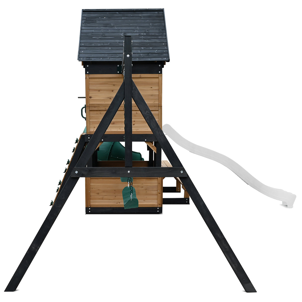 General Structure 2.2m Slide 2.9m Tube slide Upper Fort Step ladder Rock Climbing wall 2 x belt swings & trapeze Lower hideaway bench area with door Wooden roof Dimensions and Weight Assembled Dimensions: 570cm x 221.6cm x 311cm (L x W x H) Max Weight Capacity: A maximum of 54kg. per child is recommended for play activities designed for multiple child use. A maximum of 9 children is recommended for this play centre. Weight of Product: 208kg Safety Precautions Not suitable for children under 36 months - fall hazard Adult set-up required Adult supervision required at all times during use Only for domestic use Outdoor use only Natural Timber product, wood colour may vary Please allow a 2m safety perimeter Products may vary slightly from images shown On-site adult supervision is required. Place the equipment not less than 2.0 m from any structure or obstruction such as a fence, garage, house, overhanging branches, laundry lines, or electrical wires. Do not install home playground equipment over hard surface to avoid serious injury to the equipment user. Warranty 12 months manufacturer's defect on parts 3 years warranty on wood rot and insect damage Assembly Required: This product arrives flat-packed with assembly instructions included.