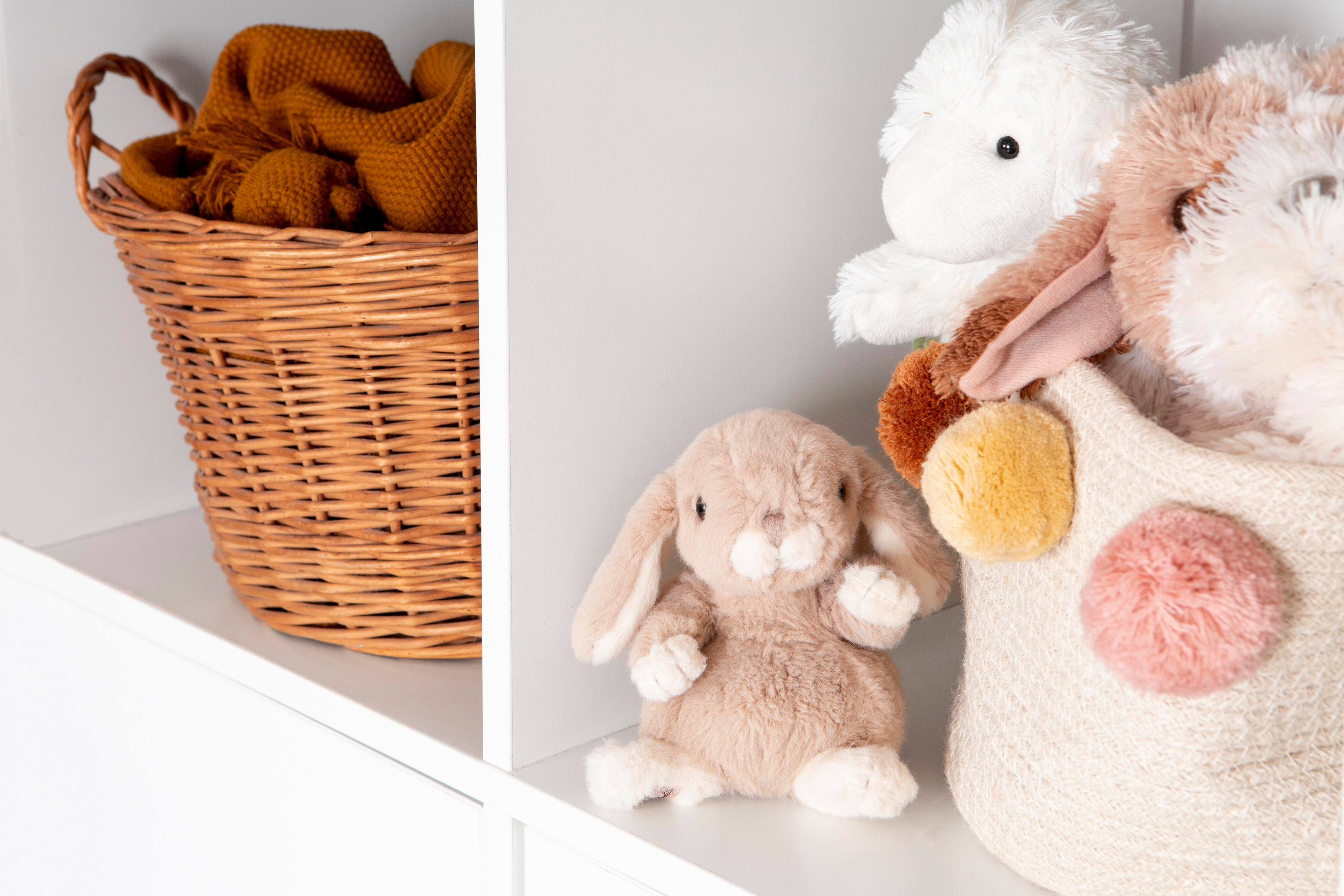 Pretend kitchen play set with kitchen cupboards that open and close. Wood combined with MDF for sturdiness. Water-based paint is safe for children and odourless. A convenient handle helps you move the kitchen around.