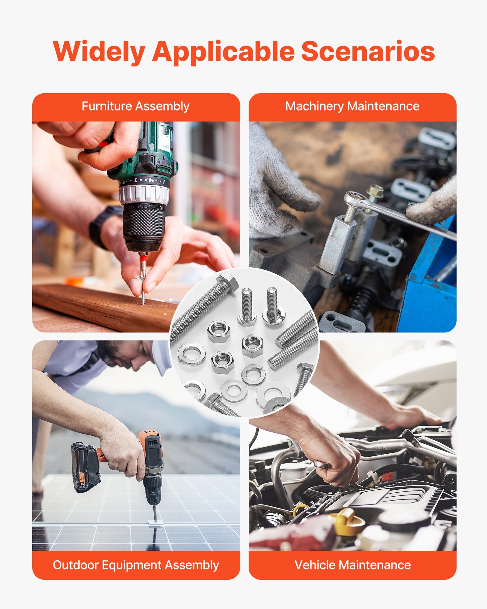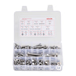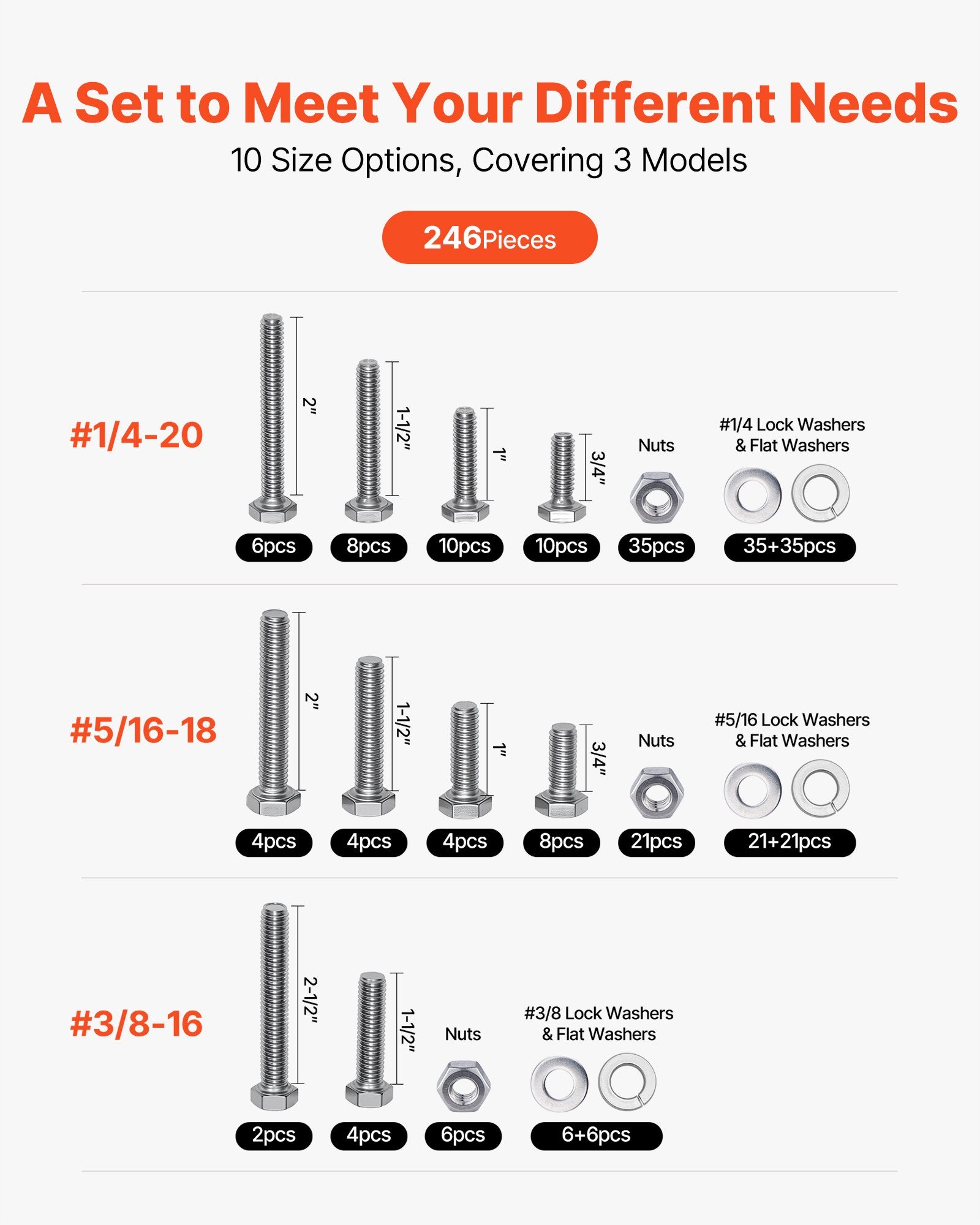 This practical bolts, nuts, and washers set includes 246 pieces of imperial bolts, nuts, and washers, covering #1/4-20, #5/16-18, #3/8-16 (including flat washers and spring washers in #1/4, #5/16, #3/8 sizes) in various lengths. Ideal for general repairs and replacements