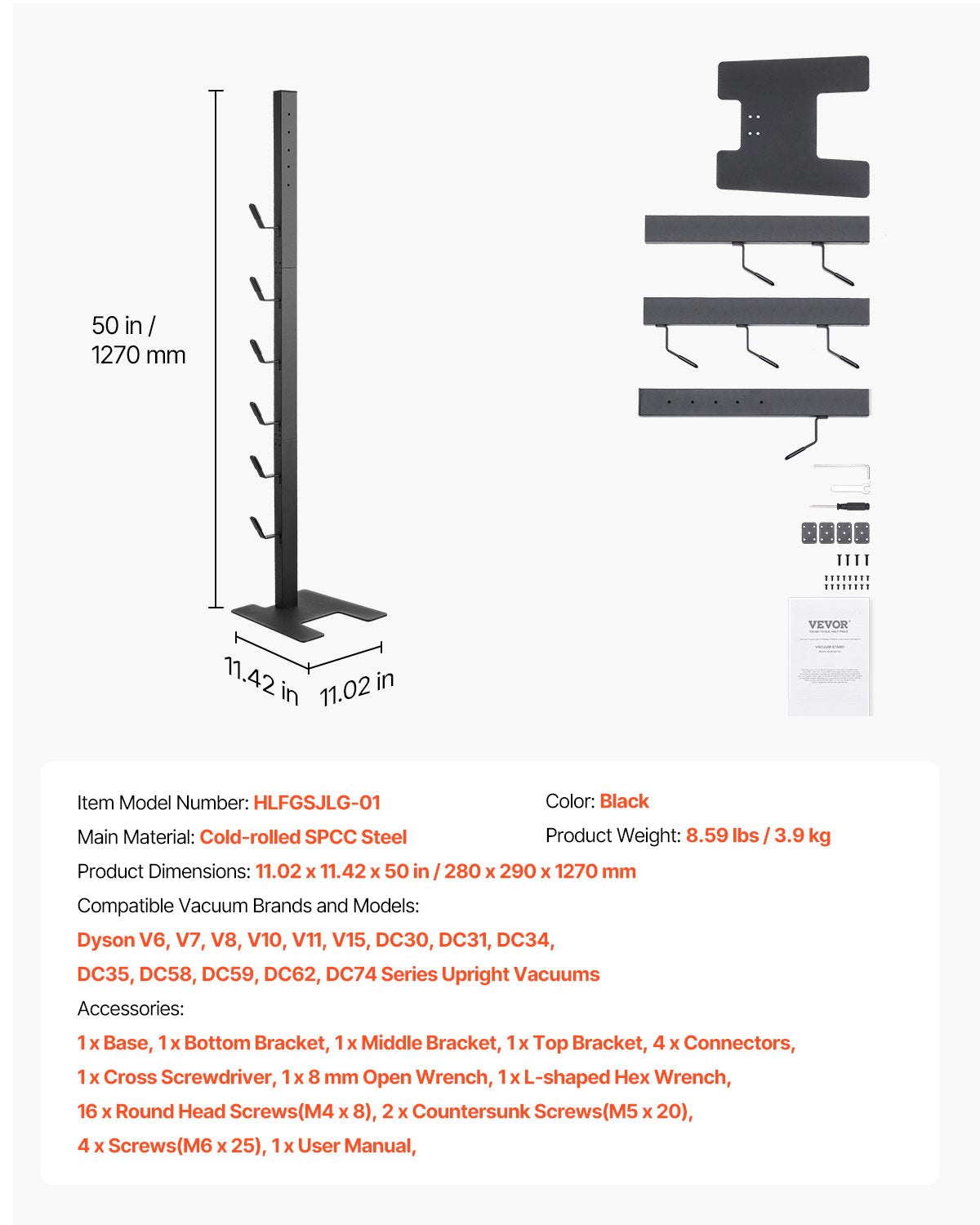 This vacuum stand stands at 50 in/1270 mm, with 6 hooks to neatly store your vacuum and accessories, avoiding loss. It saves space, avoids accidental drops and damage, and extends the vacuum's lifespan while keeping your home tidy.